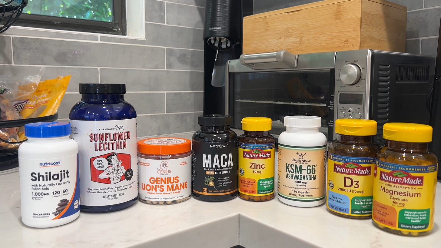 After filming the episode, I spread out my entire supplement stack on the counter.